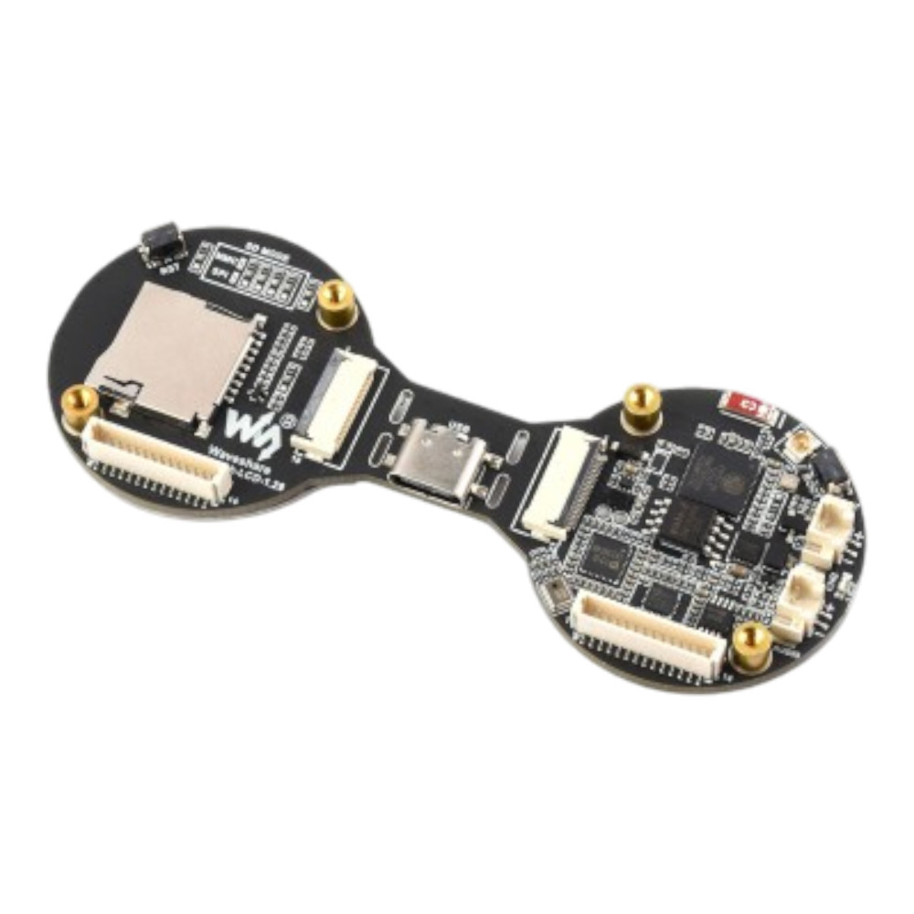 Dieses Entwicklungsboard kombiniert zwei integrierte 1.28-Zoll-IPS-Touchdisplays mit einer Auflösung..