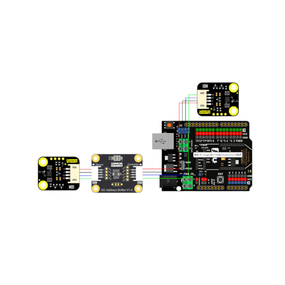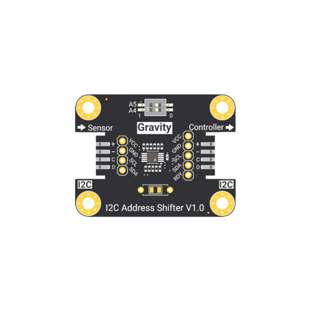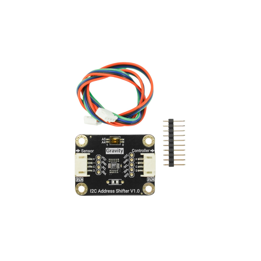 Il DFRobot Gravity I2C Adressenwechsler DFR1193 è un modulo utile per evitare conflitti di indirizzo sul bus I2C. Molti dispositivi I2C hanno indirizzi fissi e quindi non è possibile utilizzarli in modo multiplo simultaneamente. Questo modulo consente la trasparente traslazione degli indirizzi, permettendo a due dispositivi con indirizzo identico di essere utilizzati simultaneamente su un controller. Offre due canali I2C separati e supporta la trasmissione bidirezionale del segnale, senza influenzare la comunicazione. Grazie alla logica compatibile a 3,3 V e 5 V e all'interfaccia Gravity, l'integrazione è particolarmente semplice. Con il suo design compatto, l'Address Shifter è ideale per sistemi di smart home, applicazioni IoT e prototipazione.