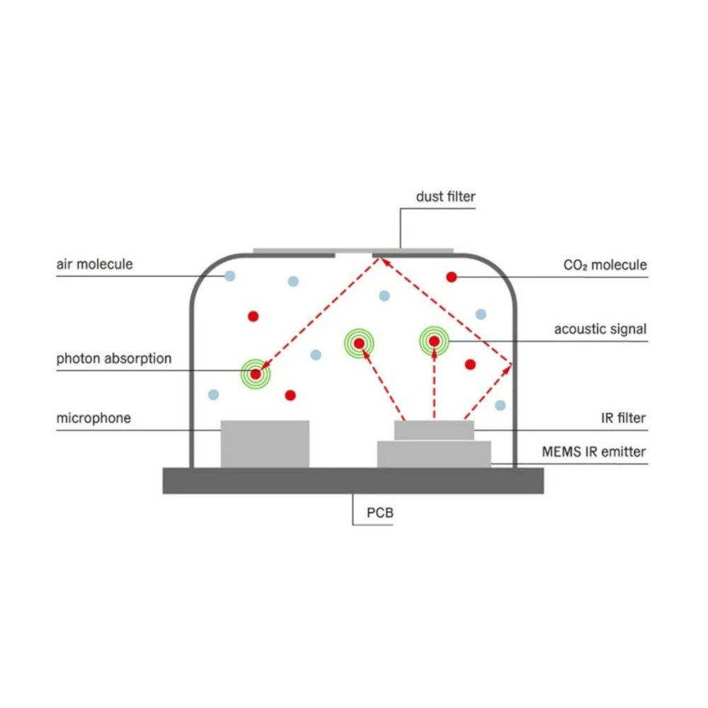- Principio di misurazione NDIR fotoacustico (Sensirion PAsens® / CMOSens®) per una precisione di ±(40 ppm + 5 % MV) con il fattore di forma più piccolo e il consumo più basso della classe di dispositivi