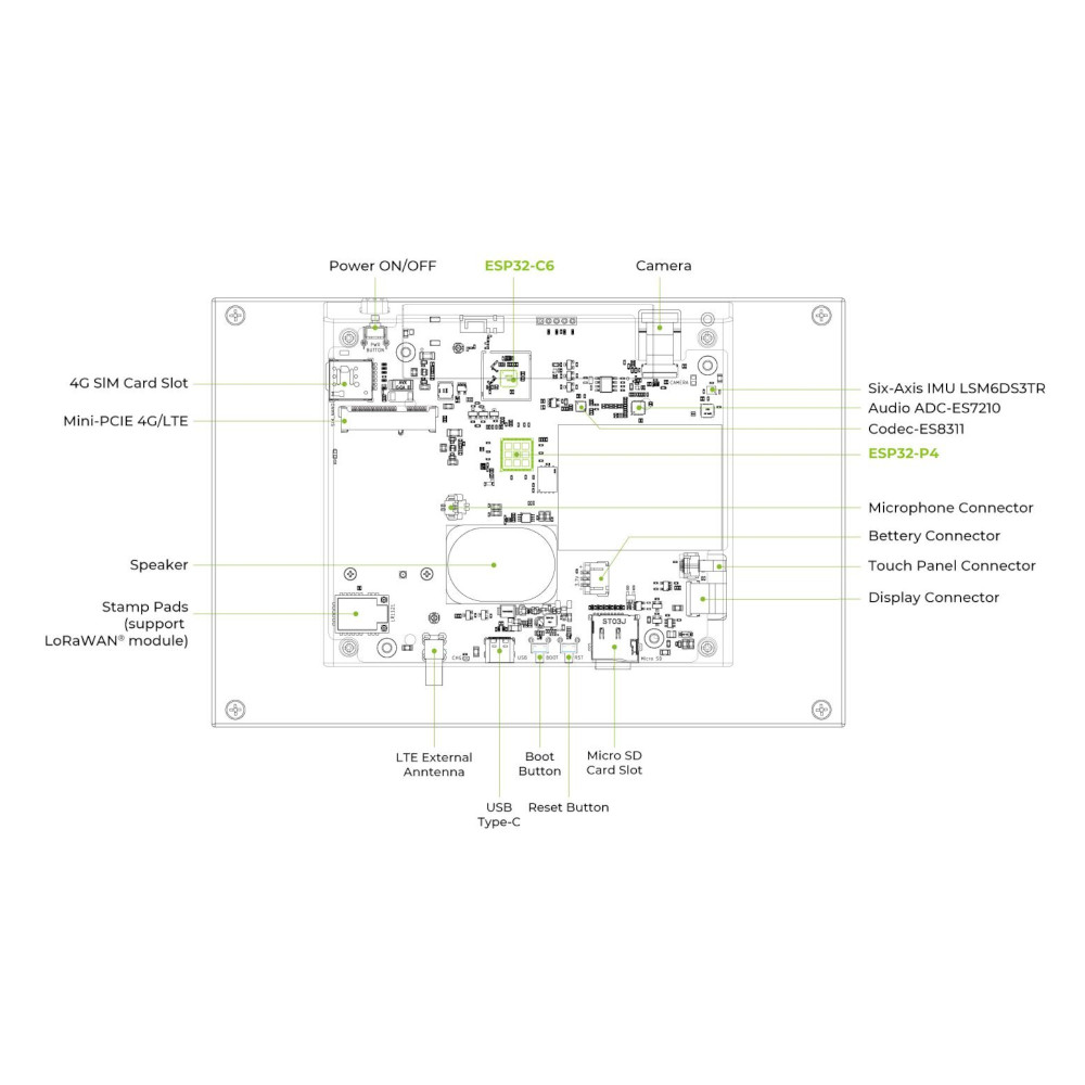 - Hauptprozessor: ESP32-P4NRW32 (32-Bit RISC-V Dual-Core, HP-Core bis 400 MHz, LP-Core bis 40 MHz)