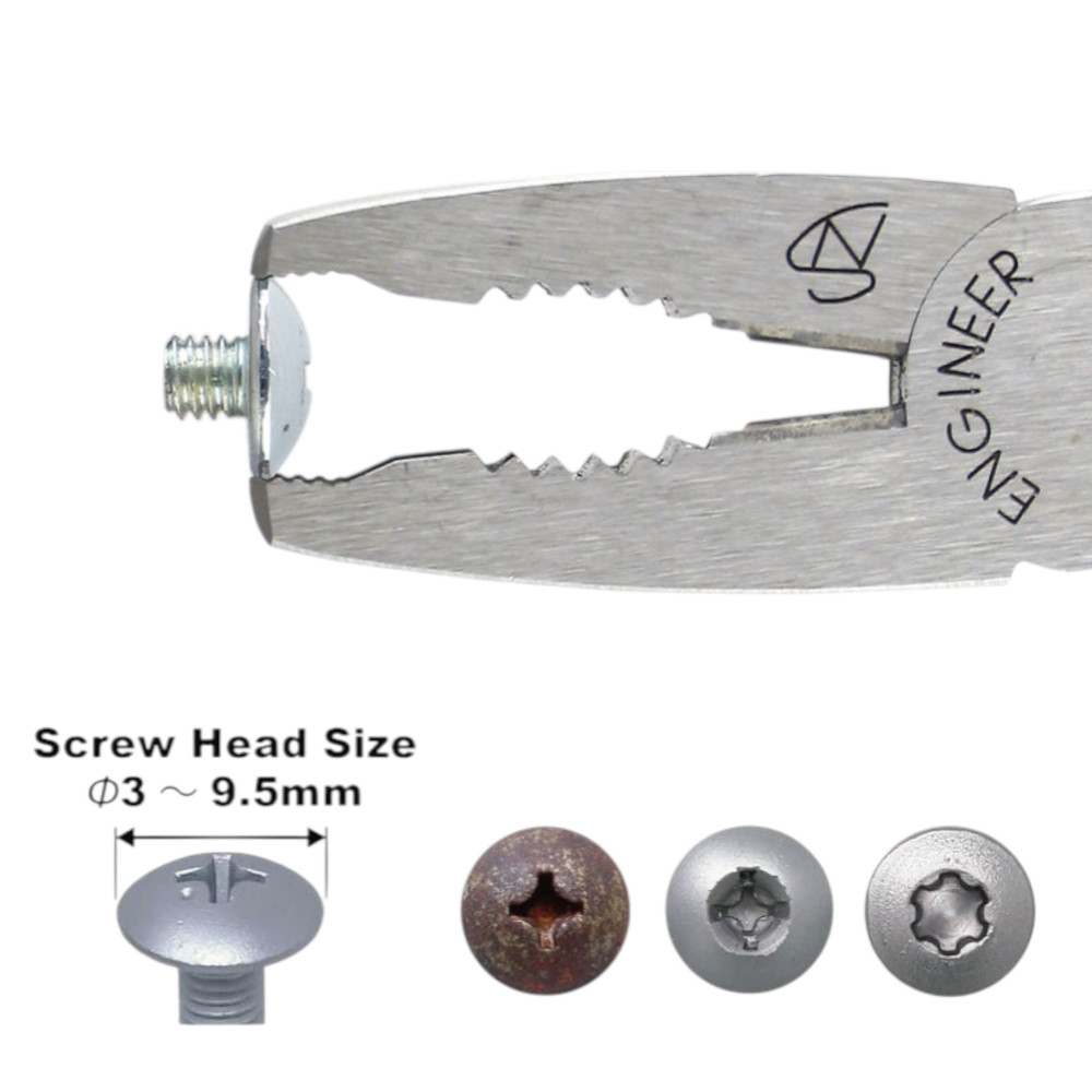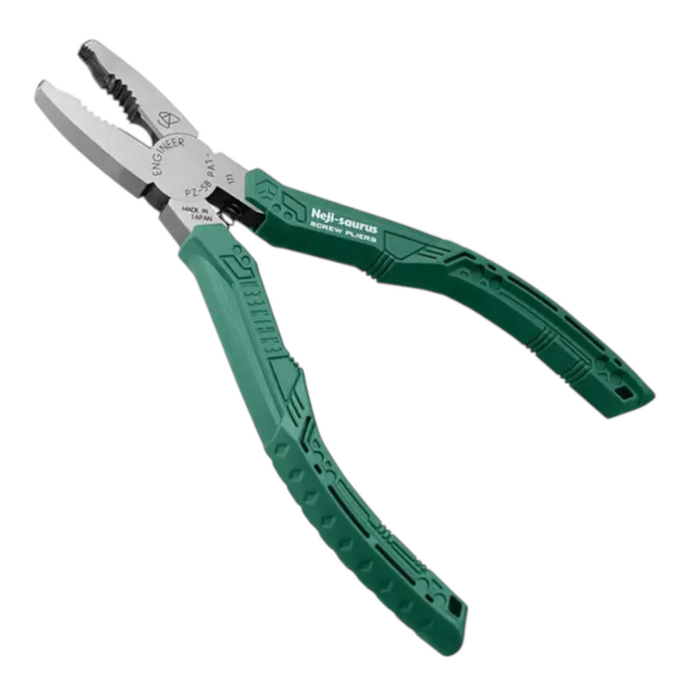 La pince à dévisser Engineer PZ-58 Neji-Saurus est une pince fabriquée au Japon, spécialement conçue pour retirer les vis endommagées, rouillées et coincées. La géométrie unique des mâchoires combine des dents verticales et horizontales qui saisissent solidement une tête de vis sans glisser. Contrairement aux pinces traditionnelles avec uniquement des dents horizontales, la géométrie des dents spéciales génère une force de préhension vers l'intérieur qui maintient la tête de vis lorsqu'elle tourne.