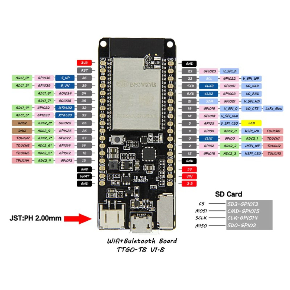 Dies ist ein Entwicklungsboard von Lilygo basierend auf dem ESPRESSIF-ESP32-Wrover Chipset. Ein 240MHz Dual-Core 32-bit Xtensa LX6 CPU bringt genügend Leistung auch für anspruchsvolle Anwendungen. Das Board ist mit allen gängigen Interface-Schnittstellen, wie UART, SPI, SDIO, PWM, I2S, I2C, IRGPIO und ADC ausgestattet. Weiter ist auch ein SD-Kartenslot, RCT, Touch Sensor Anschluss und OnBoard USB zu TTL vorhanden. Das Board wird über Micro USB mit Strom versorgt und programmiert. Dank dem ESP32 verfügt das T8 über volle Wi-Fi und Bluetooth Konnektivität.