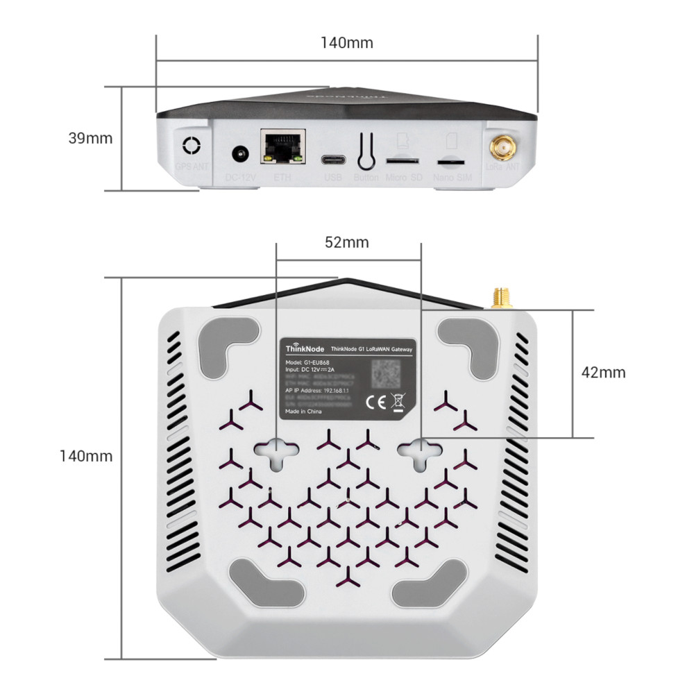 - Schnittstellen: DC-Buchse, Ethernet (RJ45), LoRa-Antennenanschluss (SMA), GPS-Antennenanschluss, USB-C, Micro-SD-Steckplatz, Nano-SIM-Steckplatz