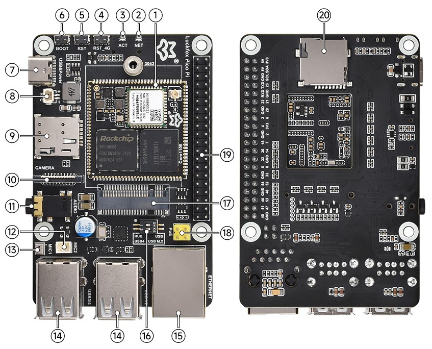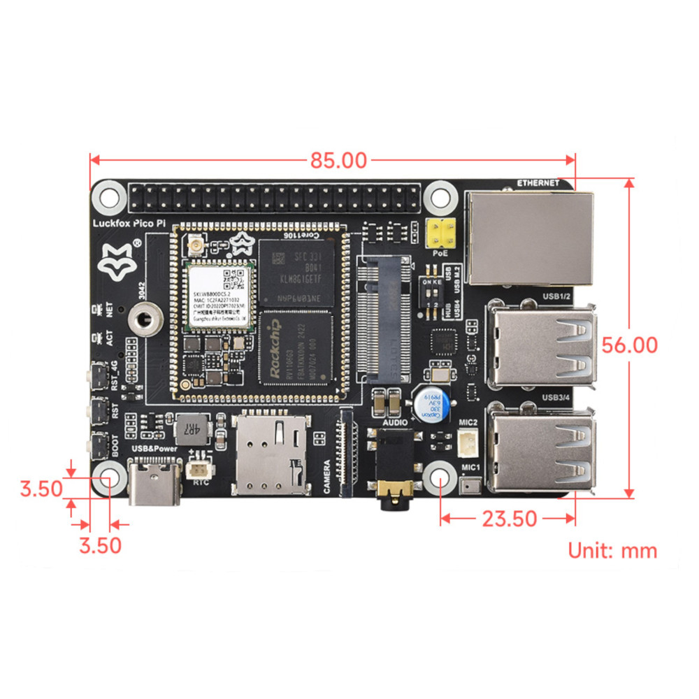 Schnellsuche Luckfox, Pico, Linux, Board, RV1106G3, Cortex-A7, NPU, ISP, eMMC, Wi-Fi 6, Bluetooth 5.2, Edge Computing, IoT, Kamera, H.264, H.265, 4G Modul, GPIO, Embedded