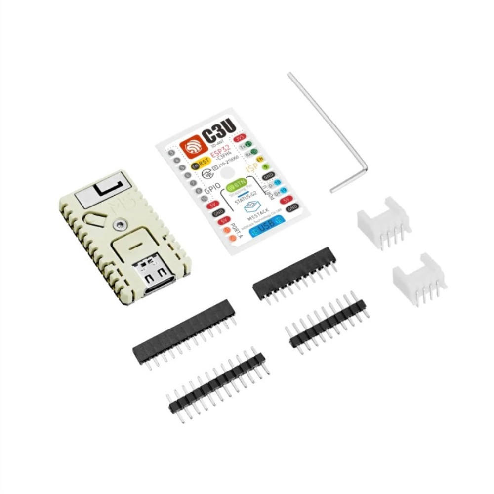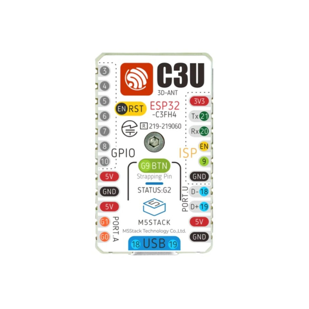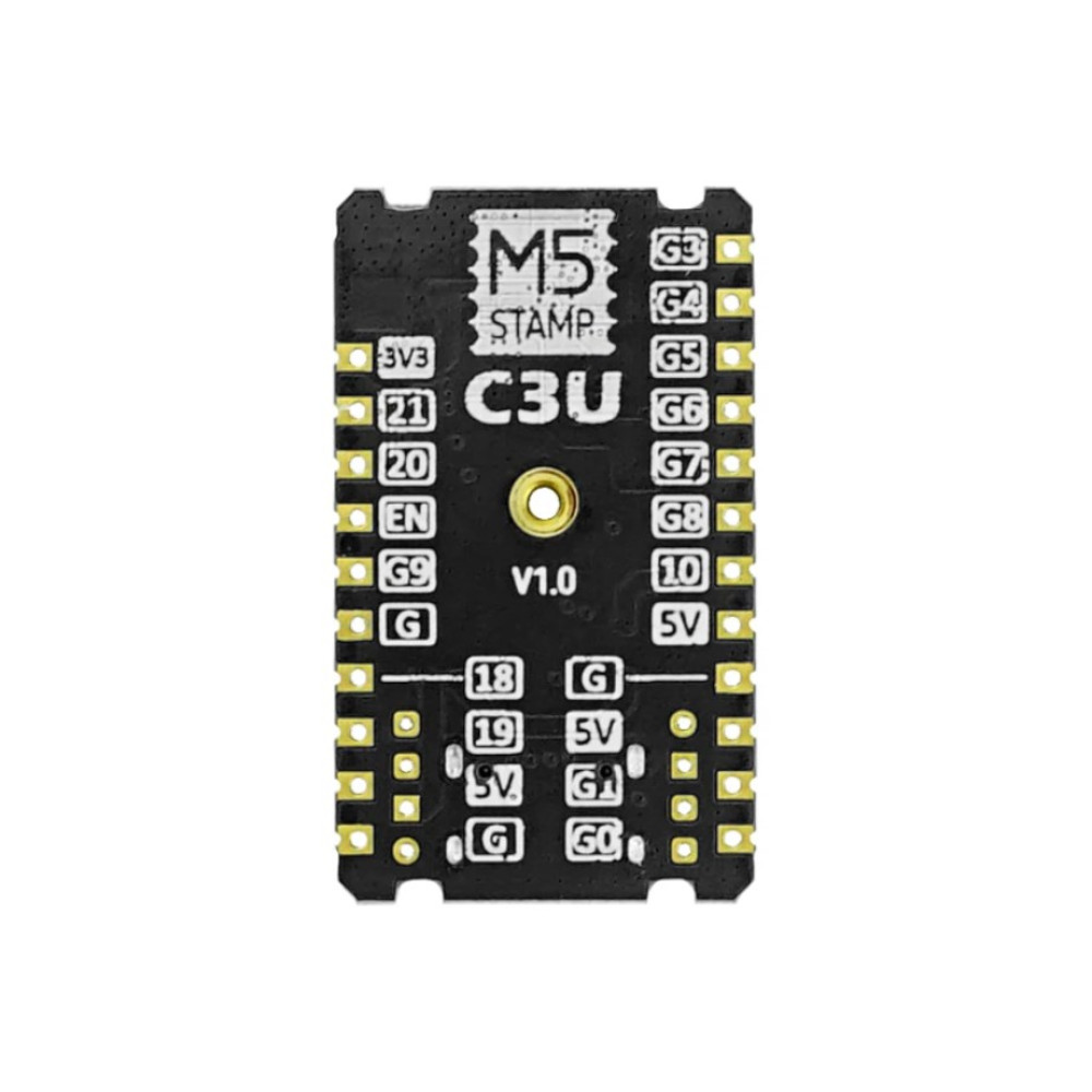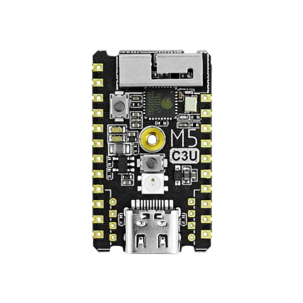 The Stamp C3U from M5Stack is based on a 32-bit RISC-V microcontroller with a frequency of 160MHz. With 400KB RAM and 4MB onboard flash memory, it can handle many different applications. The Stamp C3U supports WiFi and Bluetooth 5.0 as well as the Bluetooth mesh function. The STAMP C3U supports the UIFlow graphical programming platform, is script-free, supports Cloud Push and is fully compatible with Arduino, MicroPython, ESP32-IDF, and other mainstream development platforms for quickly creating various applications. The difference between the C3U and the C3 Mate is that the C3U does not have a built-in USB download chip. The C3U uses the USB-serial interface from the ESP32-C3 for downloading.