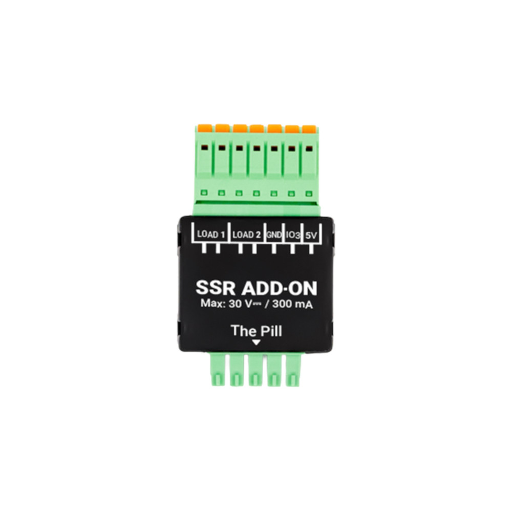 Das Shelly Pill SSR Add-on ist ein Dual-Kanal Solid-State-Relais-Modul, das in Kombination mit dem Shelly The Pill die Steuerung von zwei unabhängigen Gleichstromlasten ermöglicht. Wichtig: Für den Betrieb werden zusätzlich der Shelly The Pill sowie das 5-Terminal Add-on benötigt, da das SSR Add-on über dieses Schnittstellenmodul mit dem Pill verbunden wird. Jeder Kanal kann Lasten mit bis zu 30 V und 300 mA schalten, was das Modul ideal für LED-Streifen, kleine Lüfter, Magnetventile und andere Niederspannungsverbraucher macht. Die galvanisch isolierten Solid-State-Relais sorgen für sicheres und geräuschloses Schalten ohne mechanischen Verschleiss. Zusätzlich zu den beiden Relaisausgängen verfügt das Add-on über einen konfigurierbaren digitalen Ein-/Ausgang mit 3,3-V-Logikpegel für weitere Automatisierungsmöglichkeiten. Das kompakte Modul mit Abmessungen von 36 × 31 × 11,5 mm und einem Gewicht von nur 12 g lässt sich platzsparend in Gehäuse und Schaltschränke integrieren. Die Steuerung erfolgt über die Shelly Smart Control App und kann basierend auf Sensordaten, Zeitplänen oder Szenen automatisiert werden. Das SSR Add-on arbeitet im Umgebungstemperaturbereich von 0 bis 40 °C bei einer Leistungsaufnahme von weniger als 0,6 W.